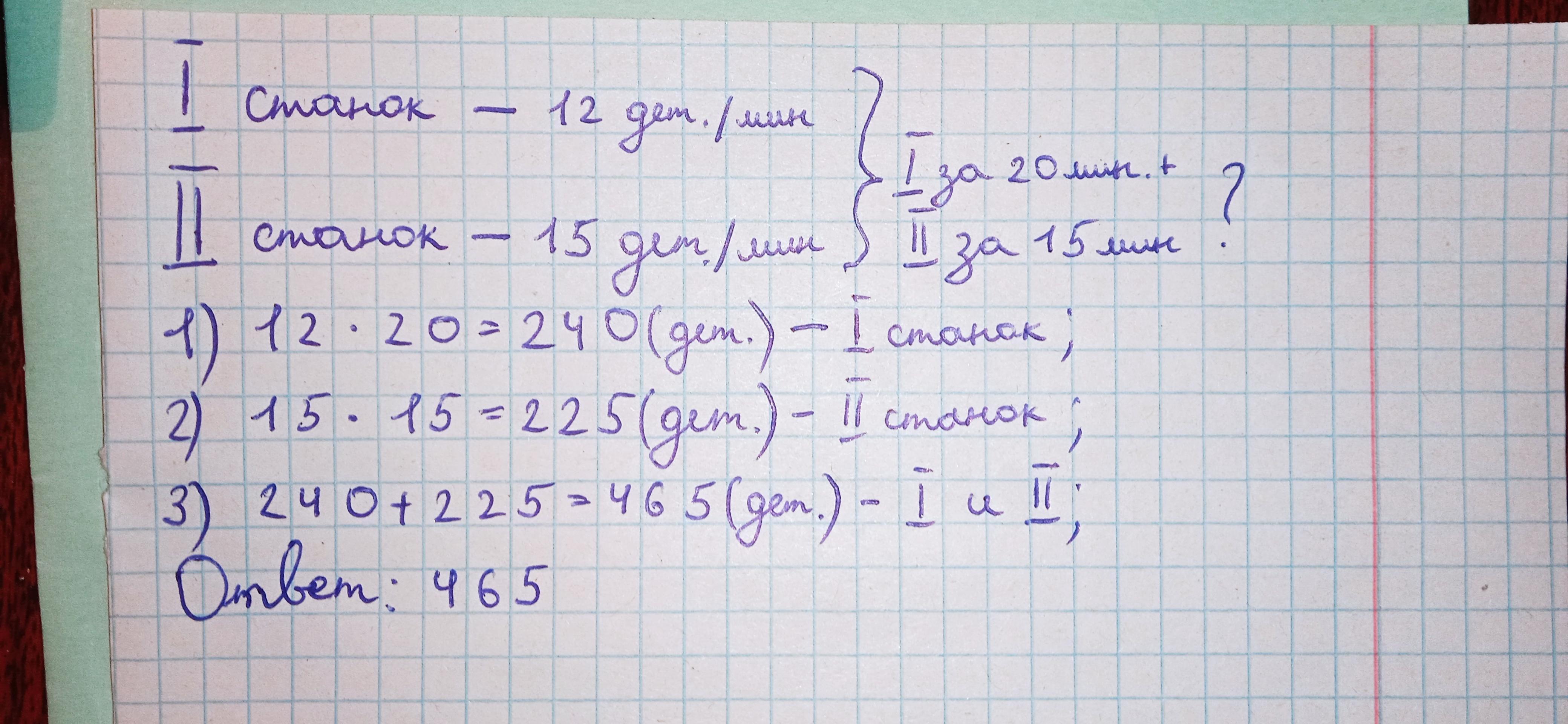 454. Один станок-автомат производит 12 деталей в минуту, а другой 15 таких же деталей. Сколько всего деталей будет изготовлено за 20 мин работы первого станка и 15 мин работы второго станка? ойств есть