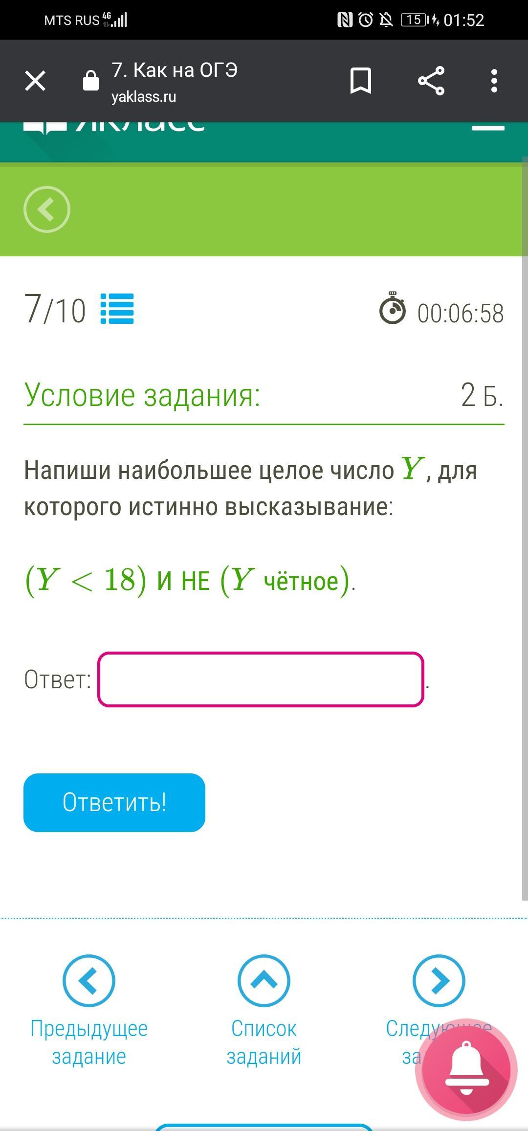Высказывание должно быть истинным, то есть истинными должны быть высказывания (Y < 18) и не (Y чётное). Это означает, что нам необходимо наибольшее число, которое меньше 18, в то же время является нечётным. Это 17.