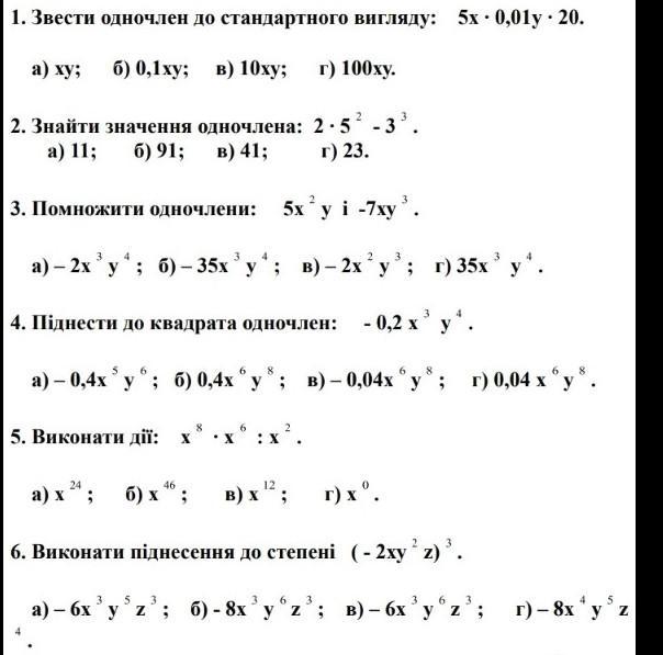 4) (-0,2x^3*y^4)^2 или же (-0,2x^3*y^4) * (-0,2x^3*y^4) = 0,04x^6*y^8.