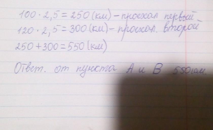 Два автомобиля выезжают одновременно из А и В навстречу друг другу и встречаются через 2, 5 часа. Найдите расстояние от А до В, если один движется со скоростью 100 км/ч, а другой – со скоростью 120 км/ч.