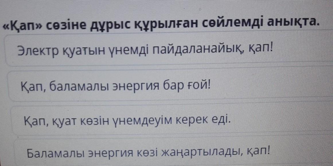 «Қап» сөзіне дұрыс құрылған сөйлемді анықта. Электр қуатын үнемді пайдаланайық, қап! Қап, баламалы энергия бар ғой! Қап, қуат көзін үнемдеуім керек еді. Баламалы энергия көзі жаңартылады, қап!