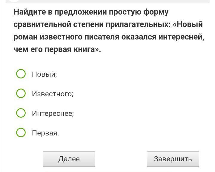 Найдите в предложении простую форму сравнительной степени прилагательных: «Новый роман известного писателя оказался интересней, чем его первая книга». Новый; Известного; Интереснее; Первая.