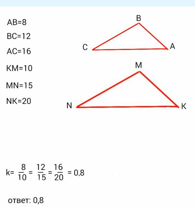 Найдите отношение площадей треугольников АВС и КМN, если АВ=8см, ВС=12см, АС=16см, КМ=10см, MN=15см, NK=20см.