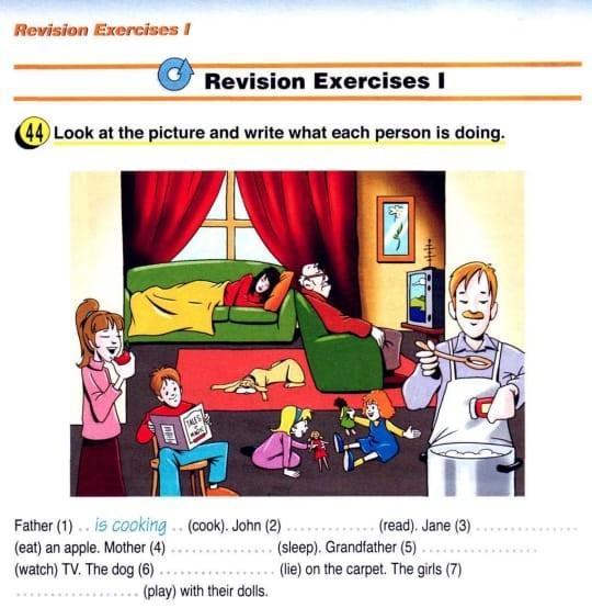 44. Look at the plcture and write what each person is doing. Fխնոլ (1) Teatrar apele Wläinen (walchi Theod NA