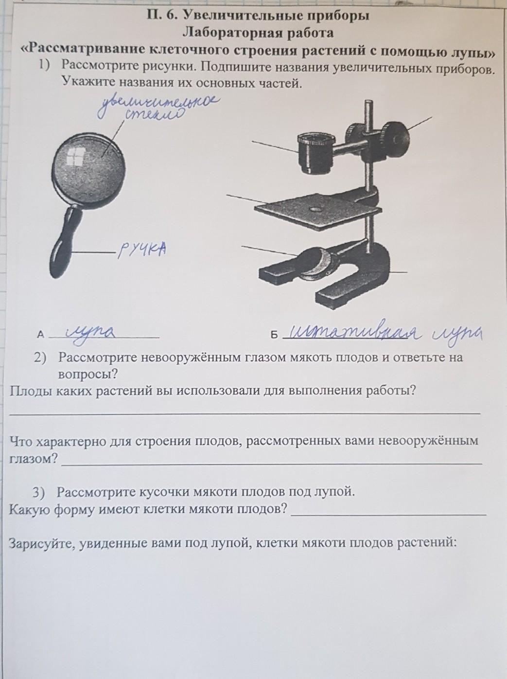 апельсин, характерно: корка, мякоть. под лупой: имеют форму растительной клетки(ядро, цитоплазма, хлоропласт, клеточная стенка, вакуоль, мембрана)