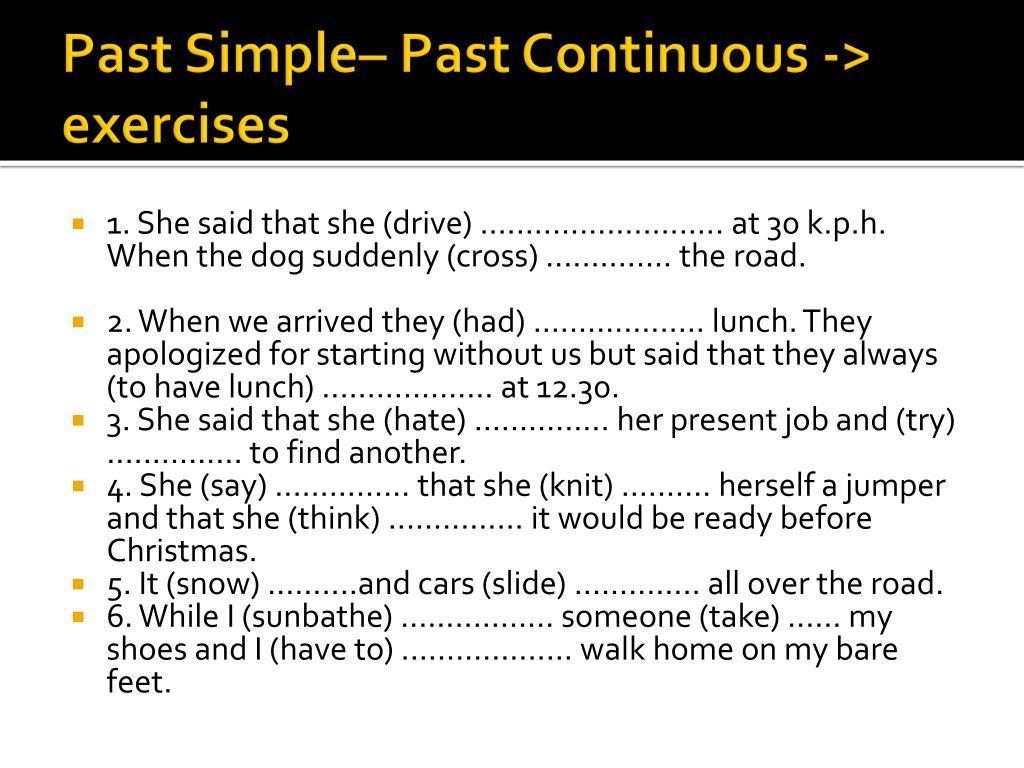 1. drivers, crossing 2. hadn't, to haven't lunch 3. hated, trying 4. Says, knitting, thinking 5. snowing, slides 6. sunbathing, takes haven to