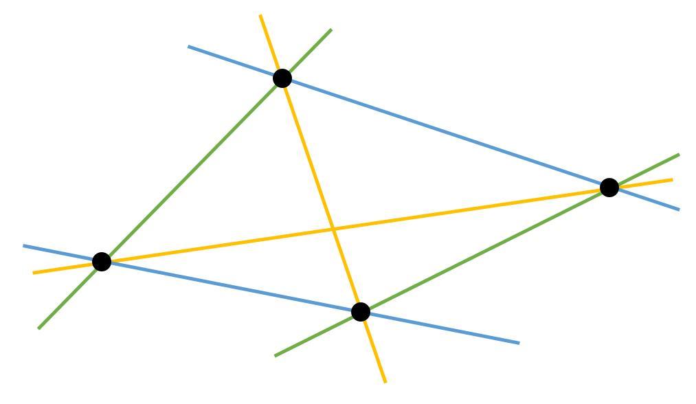 Если дано 4 точки так, что никакие 3 из них не лежат на одной прямой, то через каждые 2 точки можно провести 6 прямых.