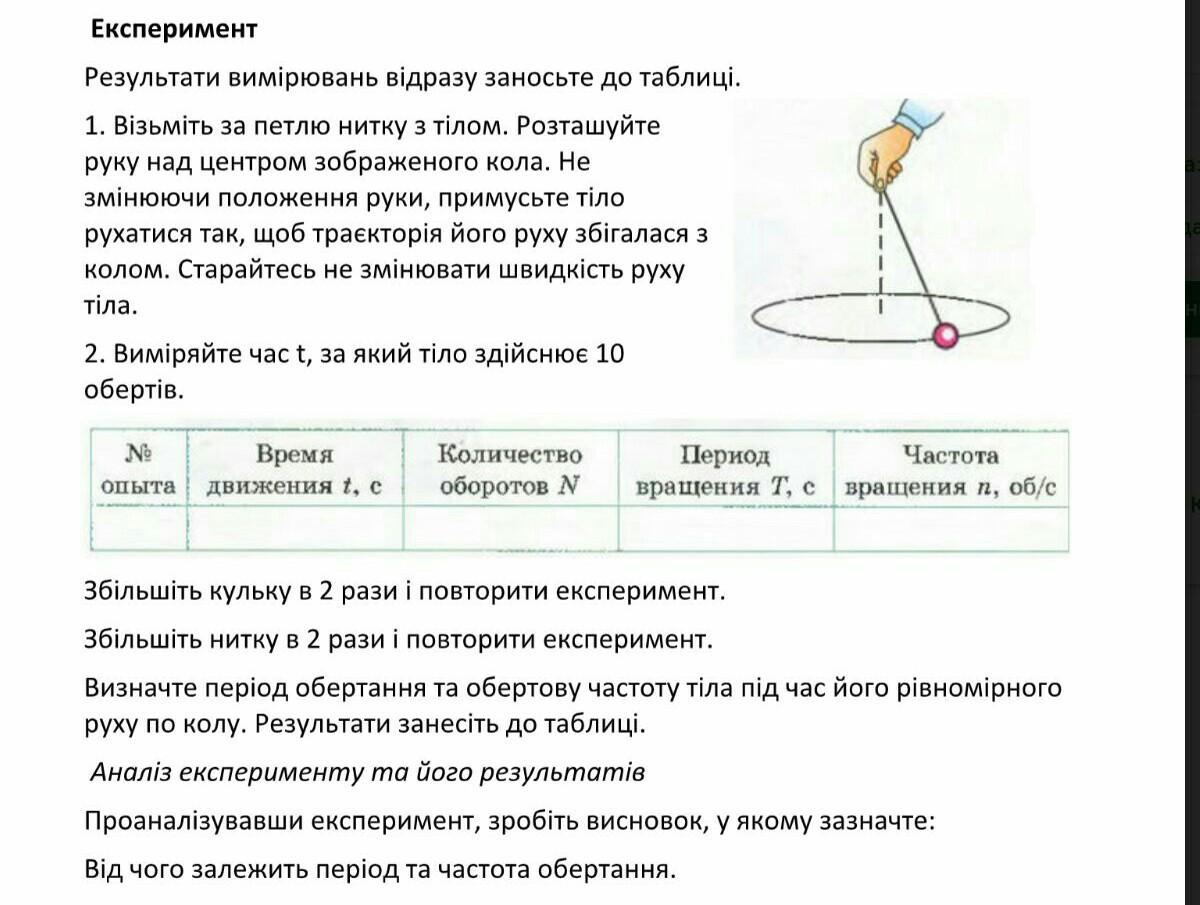 Обладнання :пластикова кулька або інше невелике тіло (гудзик, ключ, тягарець, тощо), яке можна легко закріпити на нитці; аркуш паперу із зображенням кола радіуса 15 см; міцна нерозтяжна нитка завдовжки 50-60см; секундомір; лінійка.