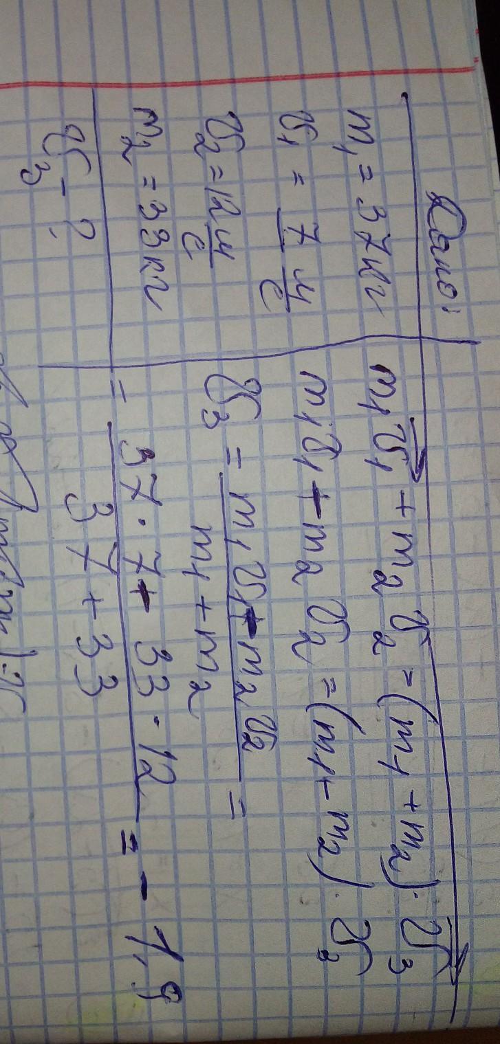 Тележка массой 37 кг движется со скоростью 7 м/с навстречу тележке массой 33 кг, движущейся со скоростью 12 м/с. После неупругого соударения тележки движутся вместе. В каком направлении и с какой скоростью будут двигаться тележки ?