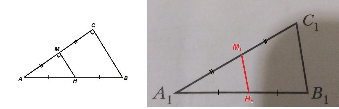 Отрезок Н₁М₁ - изображение перпендикуляра, опущенного из середины гипотенузы на катет АС.