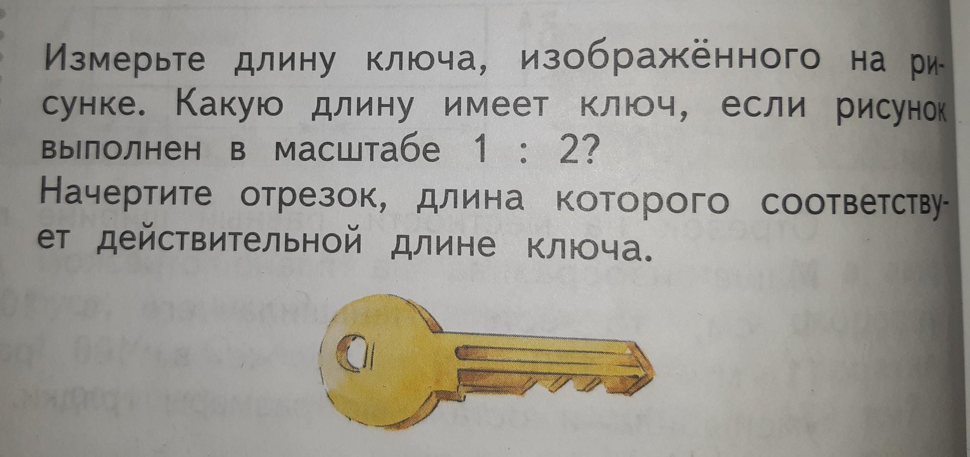 Измерьте длину ключа, изображённого на рисунке. Какую длину имеет ключ, если рисунок выполнен в масштабе 1 : 2? Начертите отрезок, длина которого соответствует действительной длине ключа.(Полным ответом пж)