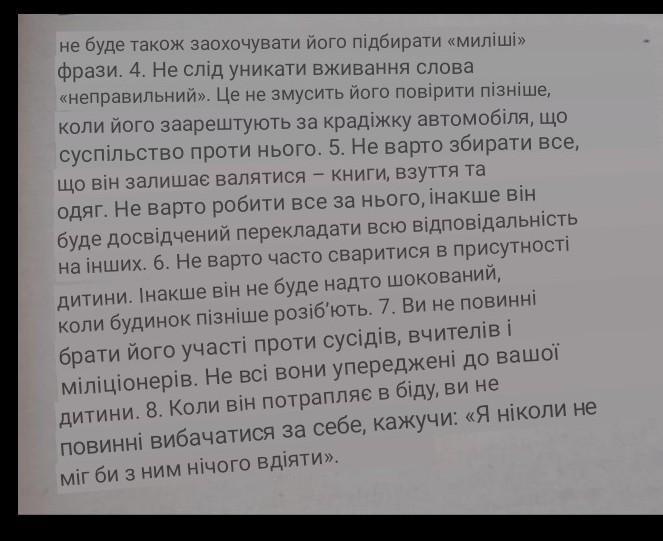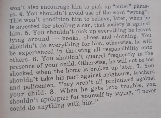 не буде також заохочувати його підбирати «миліші» фрази. 4. Не слід уникати вживання слова «неправильний». Це не змусить його повірити пізніше, коли його заарештують за крадіжку автомобіля, що суспільство проти нього. 5. Не варто збирати все, що він залишає, валяючись біля книг, взуття та одягу. Не варто робити все за нього, інакше він буде досвідчений перекладати всю відповідальність на інших. 6. Не варто часто сваритися в присутності дитини. Інакше він не буде надто шокований, коли будинок пізніше розіб’ють. 7. Ви не повинні брати його участі проти сусідів, вчителів і міліціонерів. Не всі вони упереджені до вашої дитини. 8. Коли він потрапляє в біду, ви не повинні вибачатися за себе, кажучи: «Я ніколи не міг би з ним нічого вдіяти»
