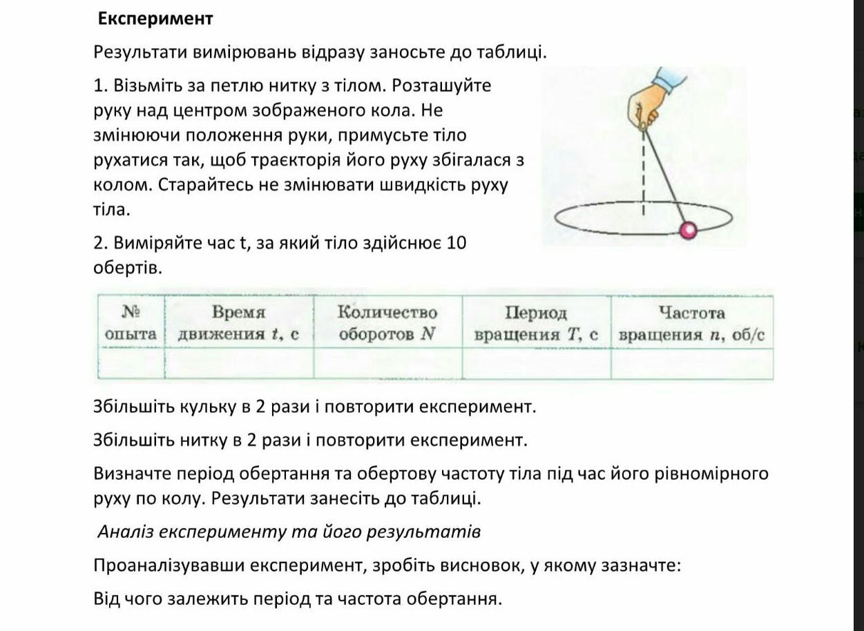 Обладнання :пластикова кулька або інше невелике тіло (гудзик, ключ, тягарець, тощо), яке можна легко закріпити на нитці; аркуш паперу із зображенням кола радіуса 15 см; міцна нерозтяжна нитка завдовжки 50-60см; секундомір; лінійка.