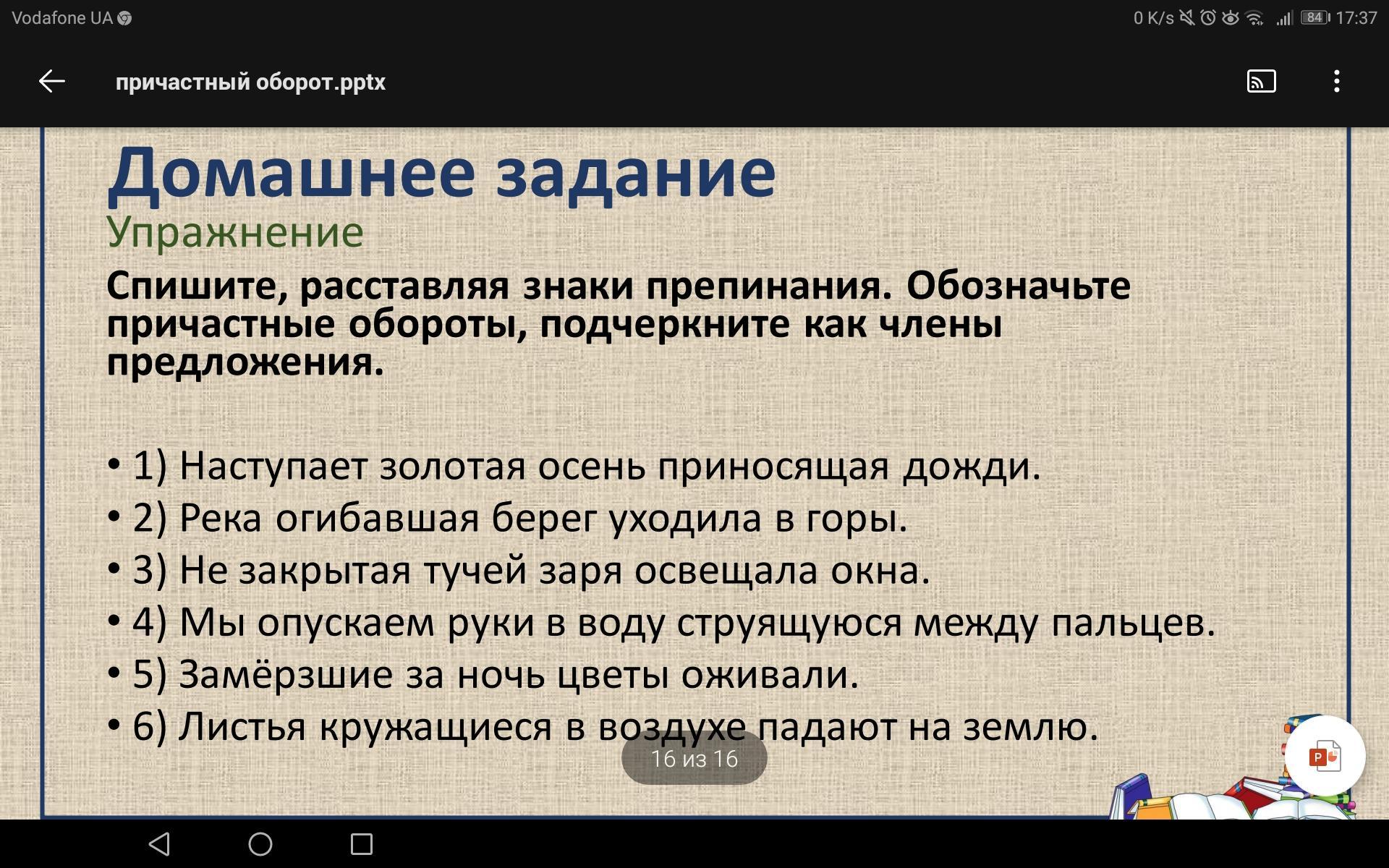 Листья,кружащиеся в воздухе,падают на землю.(оборот:кружащиеся в воздухе) Подчеркивается:~~~, _._.