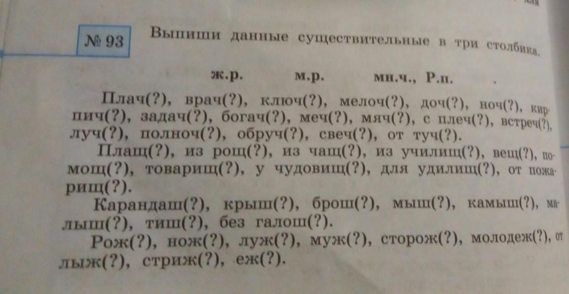 м.р: врач, ключ, кирпич, богач, меч, мяч, плащ, товарищ, карандаш, камыш, малыш, нож, муж, сторож, стриж, ёж.