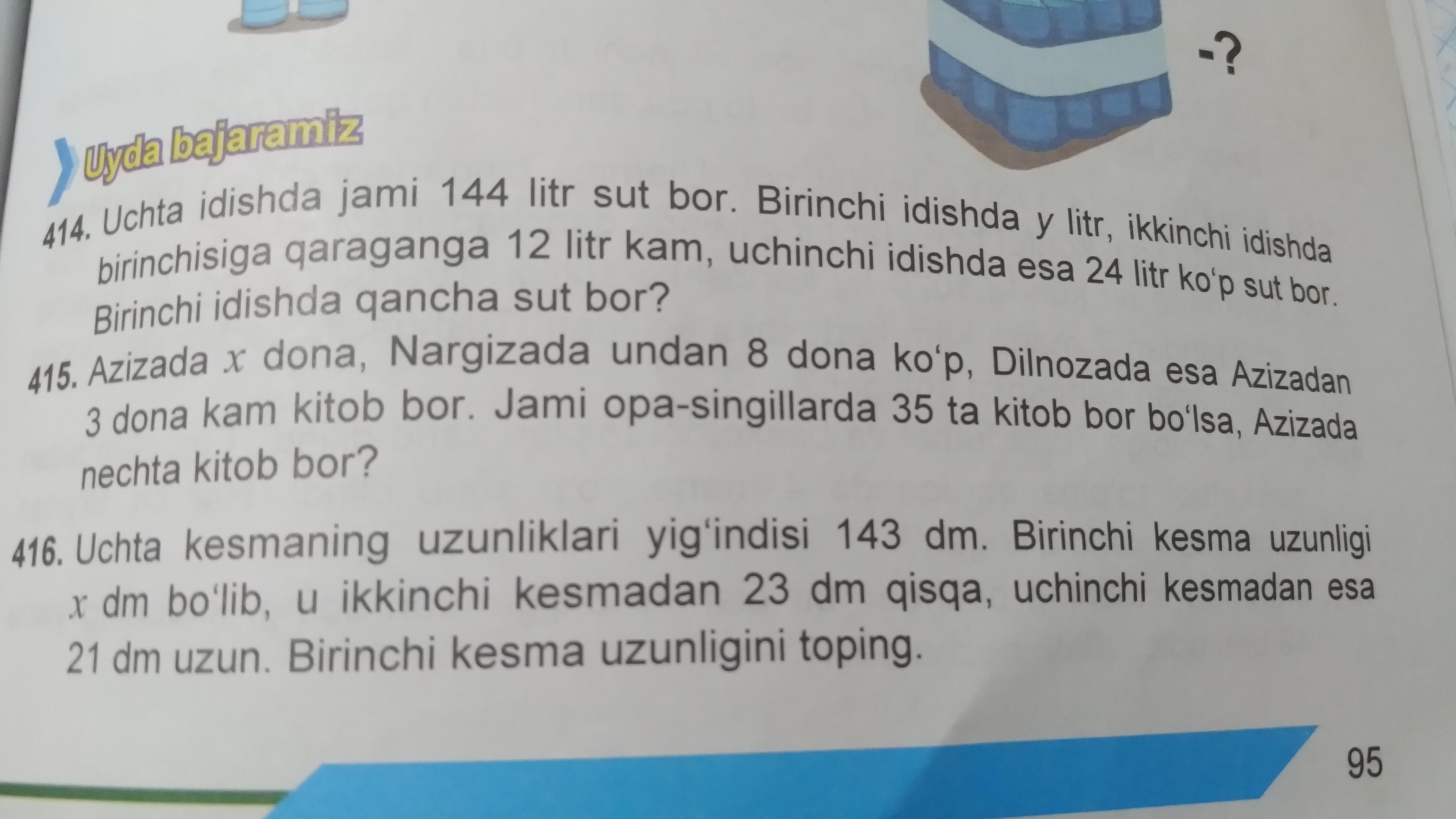 Uchta kesmaning uzunliklari yig'indisi 143 dm.Birinchi kesma uzunligi x dm bo'lib,u ikkinchi kesmadan23 dm qisqa,uchinchi kesmadan esa 21 dm uzun.Birinchi kesma uzunligini toping.