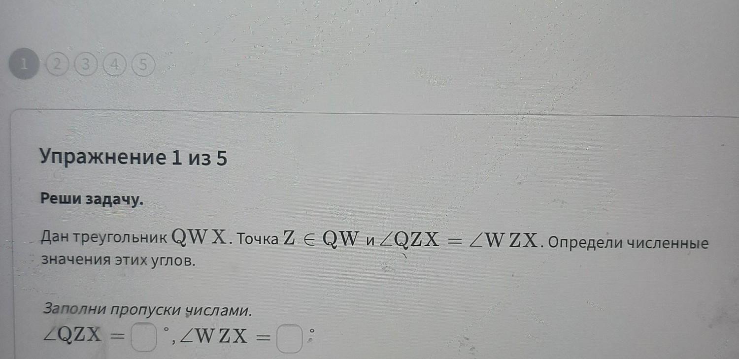 Дан треугольник QWX. Точка Z є QW и ZQZX = 2W ZX. Определи численные значения этих углов. Заполни пропуски числами. 2QZX = ", 2WZX