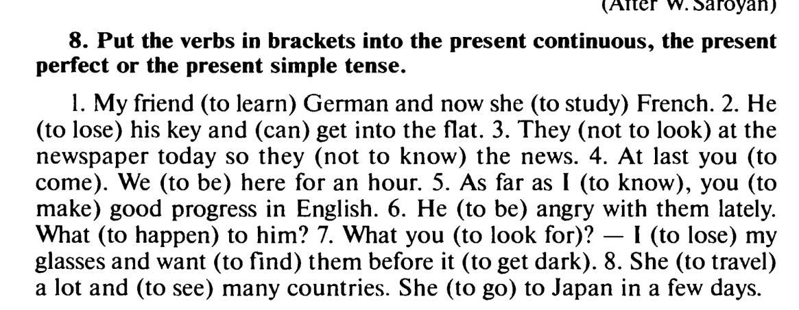 7. What are you looking for? — I have lost my glasses and want to find them before it gets dark.