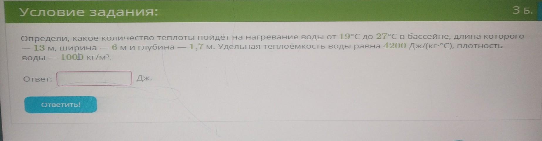 Q= 132600 кг × 4200 × ( 27 - 19) =4 455 360 000Дж