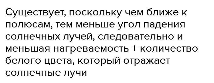 Существует, поскольку чем ближе к полюсам, тем меньше угол падения солнечных лучей, следовательно и меньшая нагреваемость + количество белого цвета, который отражает солнечные лучи