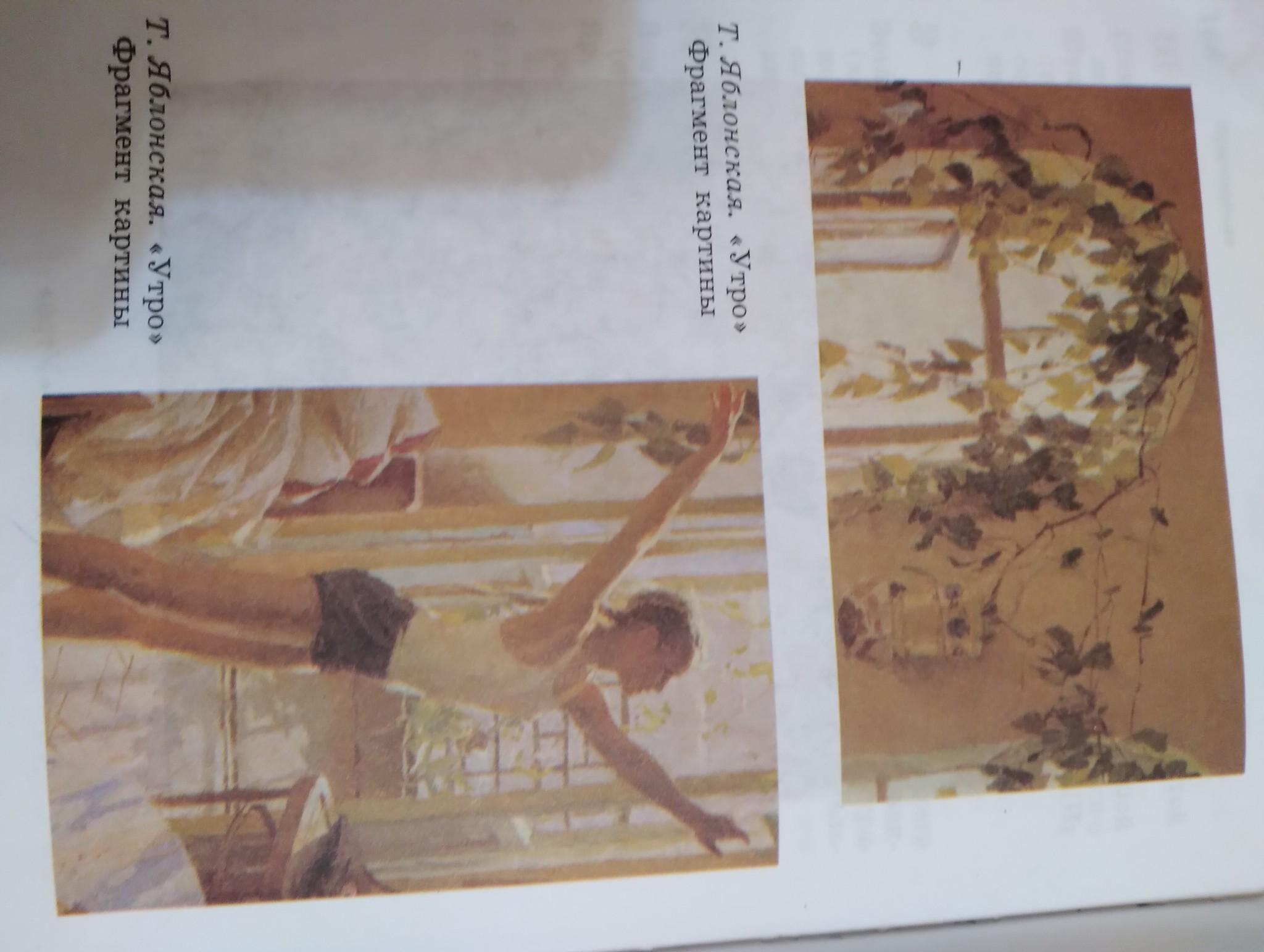Т.Яблонская написала замечательную картину на которой изображена летняя рань.На картине изображена молодая девушка,которая совсем недавно открыла глаза.Девушка,как видно на картине занимается утренней зарядкой.Одета она в лёгкую белоснежную майку и чёрные джинсовые шорты. У неё русые светлые волосы.Она заплетена в две длинные косы.