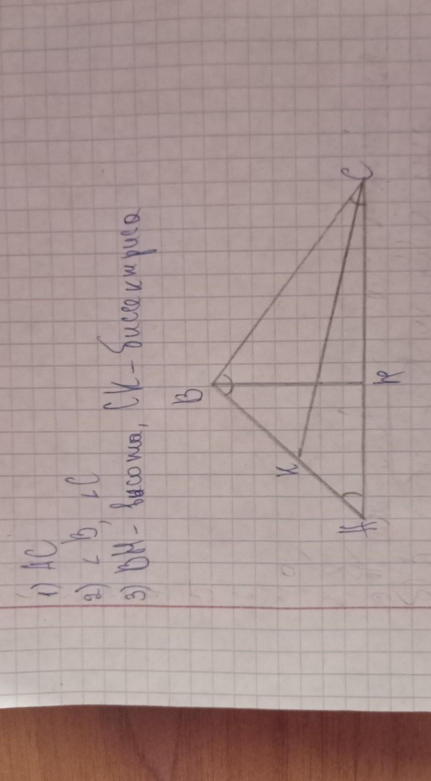 54. Начертите произвольный треугольник. Обозначьте его вершины буквами А, В, С. Укажите: 1) сторону, противолежащую углу В; 2) углы, прилежащие к стороне BC; 3) проведите высоту и биссектрису треугольника ABC, выходящие соответственно из вершин В и С.
