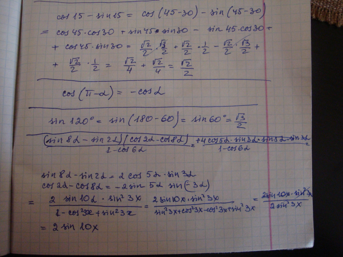 (sin(8a)-sin(2a))(cos(2a)-cos(8a))/(1-cos(6a)) = (2*sin(3a)*cos(5a))(2*sin(3a)*sin(5a))/(cos^2(3a)+sin^2(3a)-cos^2(3a)+sin^2(3a)) =