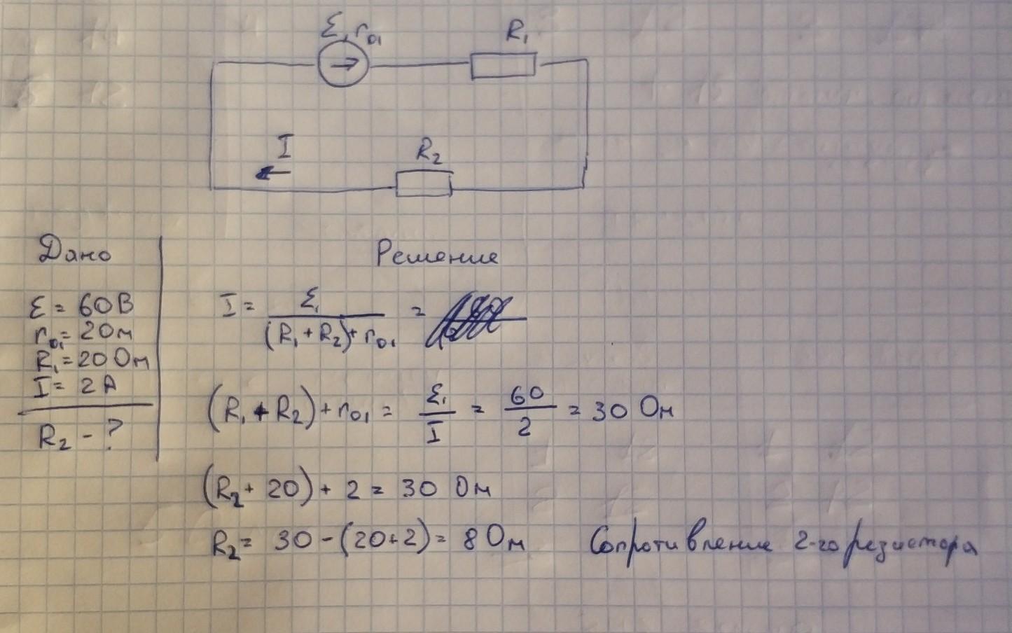 Источник тока с ЭДС 60 В и внутренним сопротивлением 2 Ом подключен к внешнему участку цепи, стоящему из двух последовательно соединенных резисторов. Сила тока в цепи 2 А, сопротивление одного из резисторов 20 Ом. Найдите сопротивление второго резистора.