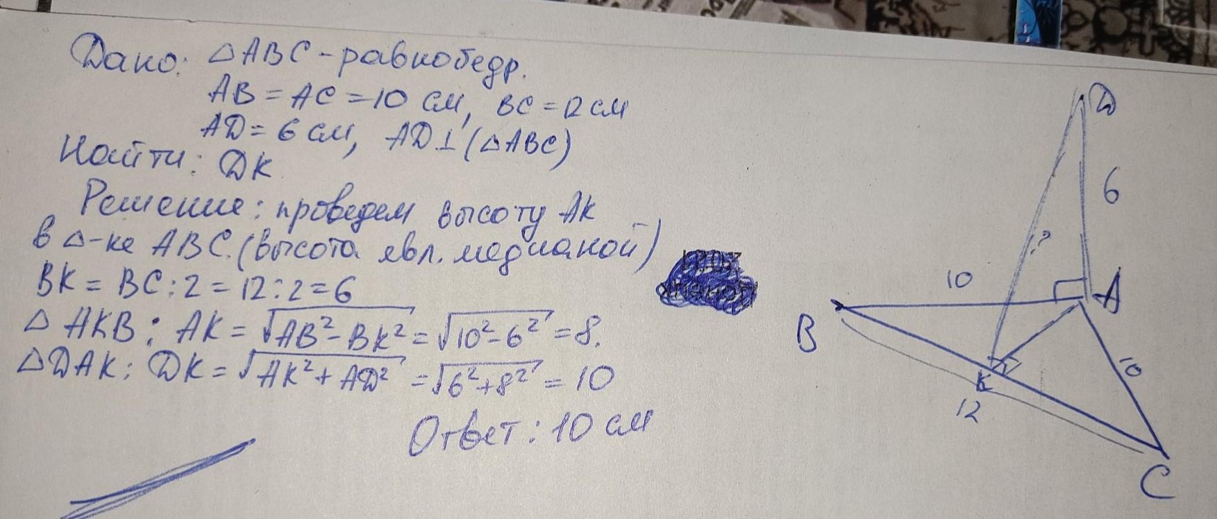 У рівнобедреному трикутнику АВС основа ВС=12 см, бічна сторона дорівнює 10 см. З вершини А проведено перпендикуляр АD до площини АВС, АD=6 см. Знайти відстань від точки D до сторони ВC