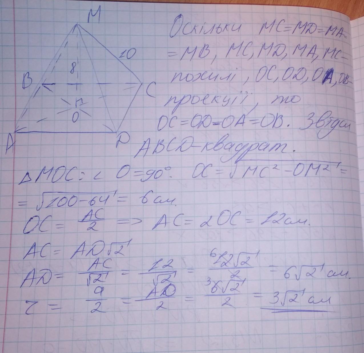 Відстань від точки М до кожної зі сторін ромба дорівнює 10 см, а до площини ромба – 8 см. Знайдіть радіус кола, вписаного в ромб.