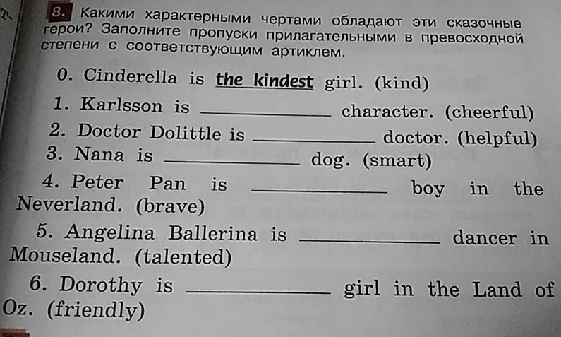 Какими характерными чертами обладают эти сказочные герои? Заполните пропуски прилагательными в превосходной степени с соответствующим артиклем.