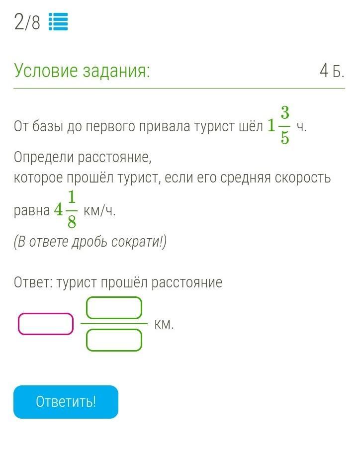 1. 3/5 * 4. 1/8 = 8/5 * 33/8 = 33/5 = 6. 3/5 (км) - прошёл турист