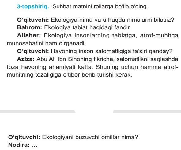 Nodira: Ekalogiani buzuvchi omillar zararli tutinlardir. Ular turli fabrikalar va boshqa iflos havo chiqaruvchi zavotlardan keladi.