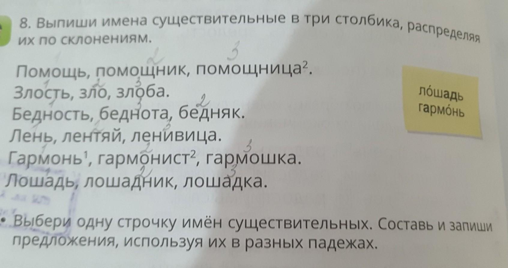1 склонение: помощница, злоба, беднота, ленивица, гармоника, лошадка