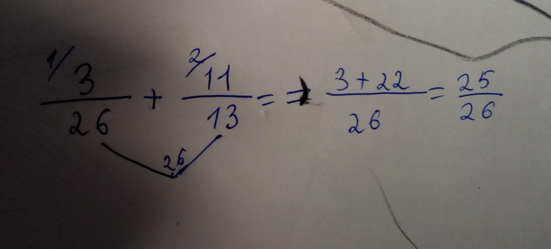 3/26+11/13=3/26+(11×2)/(13×2)=3/26+22/26=25/26