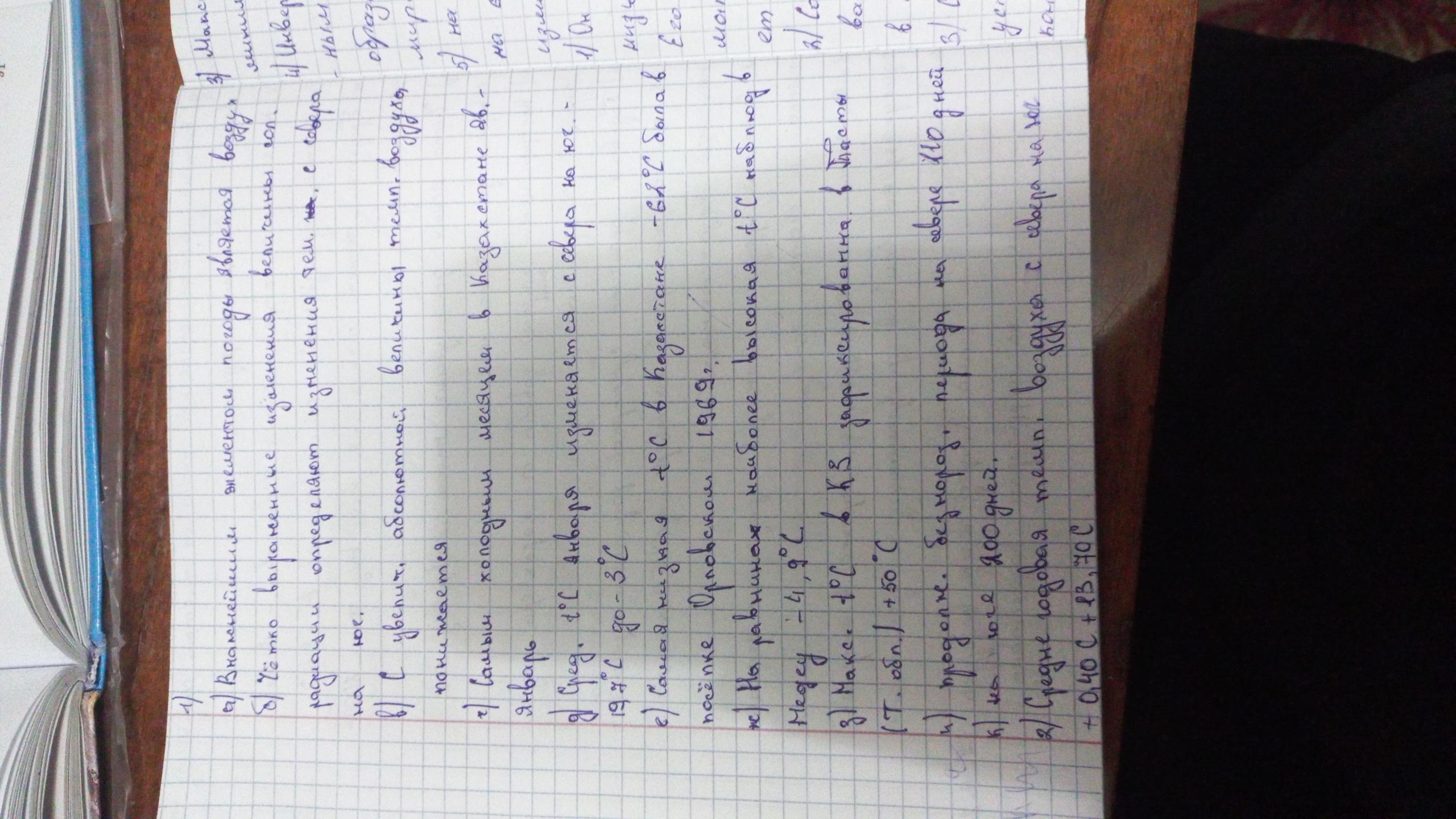 д) Средняя температура января изменяется с севера на юг от ... до .... е)Самая низкая температура (-62°C) Казахстана была зафиксирована в ..