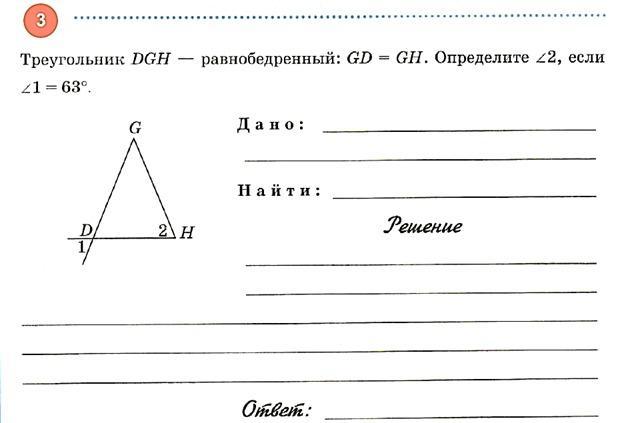 Дано: ΔDGH (GD=GH); ∠1=63°. Найти: ∠2. Решение: ∠1=∠GDH (как вертикальные); у равнобедренного треугольника углы при основании равны ⇒ ∠GDH=GHD=63°. Ответ: ∠2=63°.