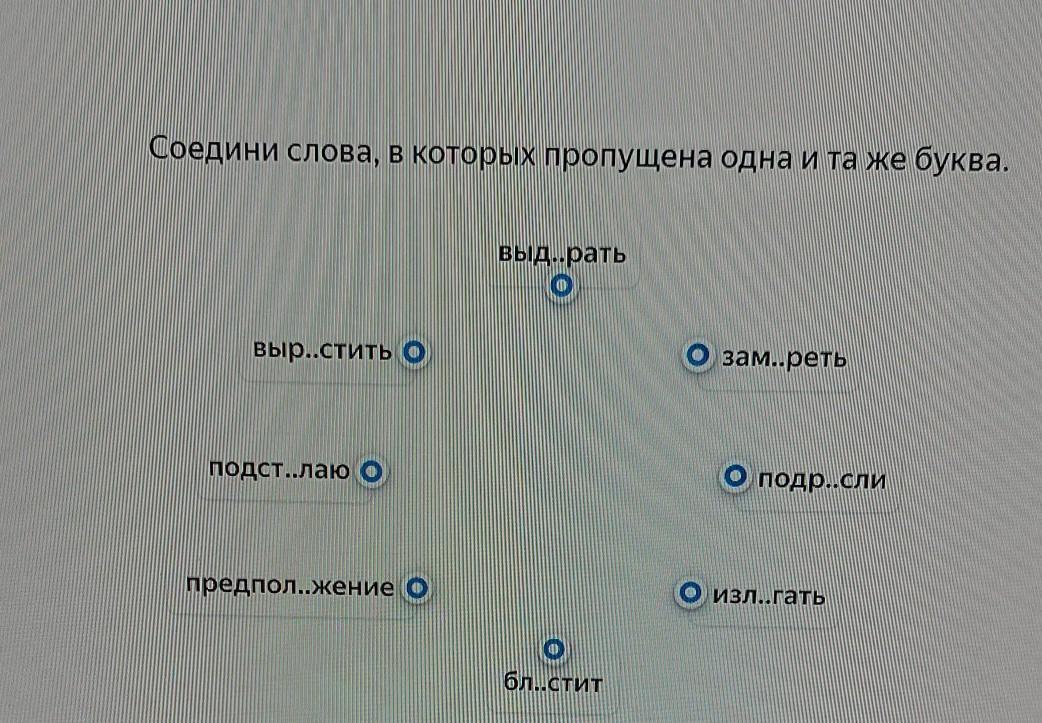 Соедини слова, в которых пропущена одна и та же буква. Выд..рать Выр..стить о зам..реть подст..лаю о подр..сли предпол..жение изл.гать О бл..стит