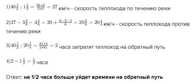 Теплоход проходит 40 1/2 км по течению реки за 1 1/2 ч. На сколько больше времени уйдёт на обратный путь , если скорость течения равна 3 3/8 км/ч?