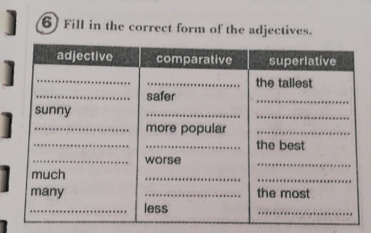 Пж помогите дам 100 баллов 6 Fill in the correct form of the adjectives. adjective comparative superlative the tallest safer Sunny more popular ine best worse much many the most less.