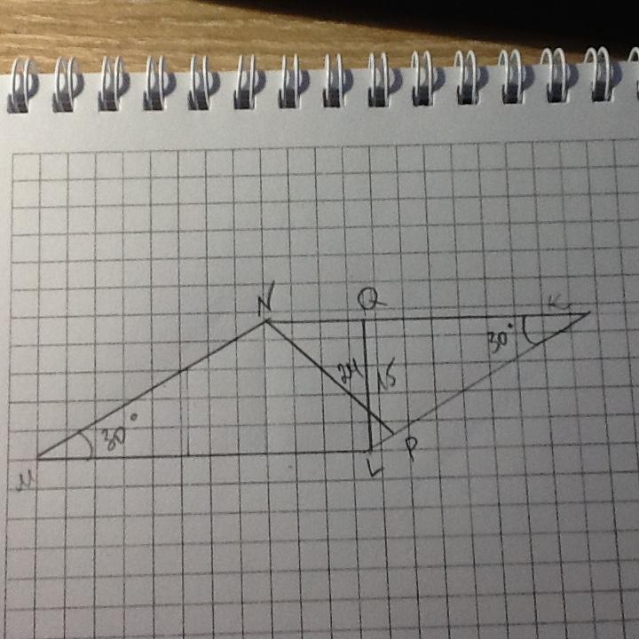 Дан параллелограмм MNKL , ∠NML=30° . Высота, проведенная из вершины N к стороне LK, равна 24. А высота LQ, проведенная к стороне NK равна 15 . Найди площадь параллелограмма.