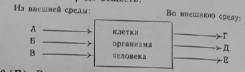 3. Против стрелок А, Б, В напишите названия веществ, поступающих из среды, против стрелок Г, Д, Е - названия отдаваемых среде веществ