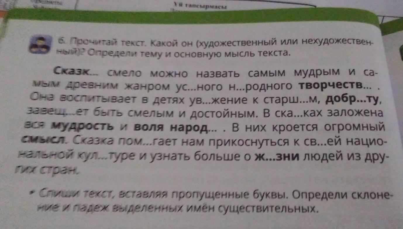 6. Прочитай текст, какой он (художественный или неудожете ный)? Определи тему и основную мысль текста. можно назвать самым мудрым и са Сказк... смело Она воспитывает в детях ув... жение к старш... м, доор...ту. завещ...ет быть смелым и достойным. В ска...ках заложена смысл. Сказка пом...гает нам прикоснуться к св...ей нацио- мым древним жанром ус...ного н...родного творчества вся мудрость и воля народ... . В них кроется огромный нальной кул...туре и узнать больше о ж...зни людей из дру гих стран. • Спиши текст, вставляя пропущенные буквы. Определи склоне ние и падеж выделенных имён существительных.