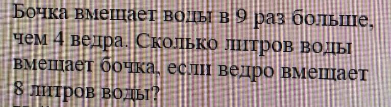 Таким образом, теперь можем найти, сколько литров воды поместится в бочку, если она может вместить в 9 раз больше по сравнению с 4 ведрами воды: