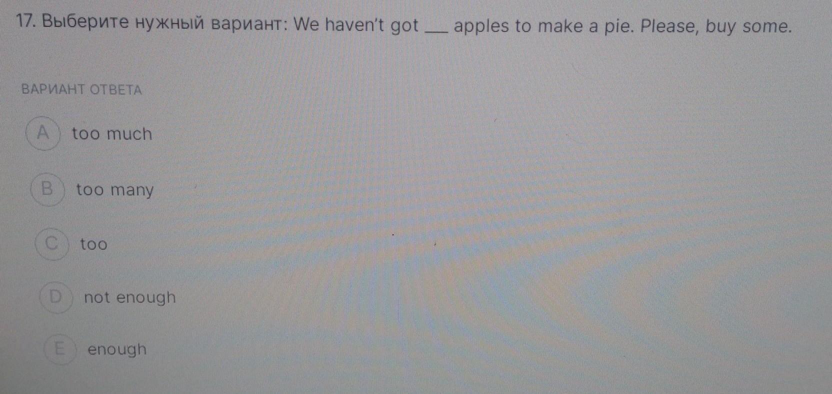 о 17. Выберите нужный вариант. We haven't got apples to make a pie. Please buy some. ВАРИАНТ ОТВЕТА too much B too many MD too not enough enough