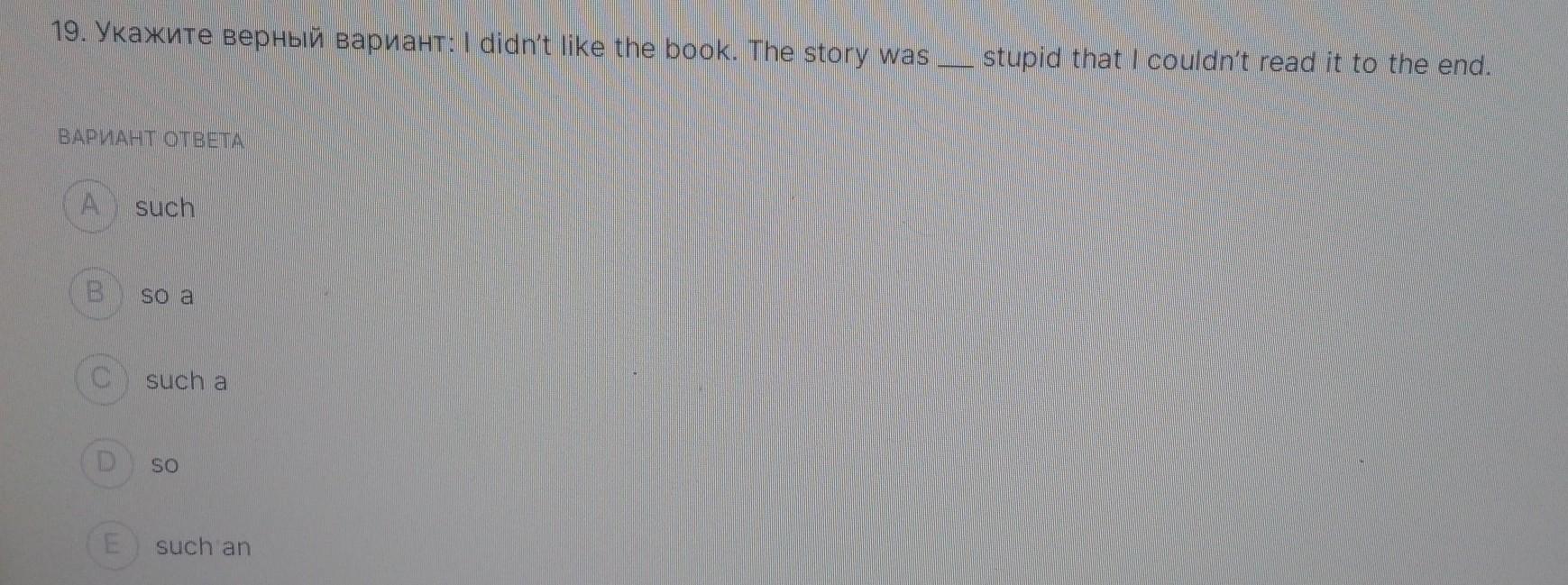 19. Ykaxute Bephbl Bapaht: I didn't like the book. The story was stupid that I couldn't read it to the end. ВАРИАНТ ОТВЕТА A such B so a C such a D SO E such an