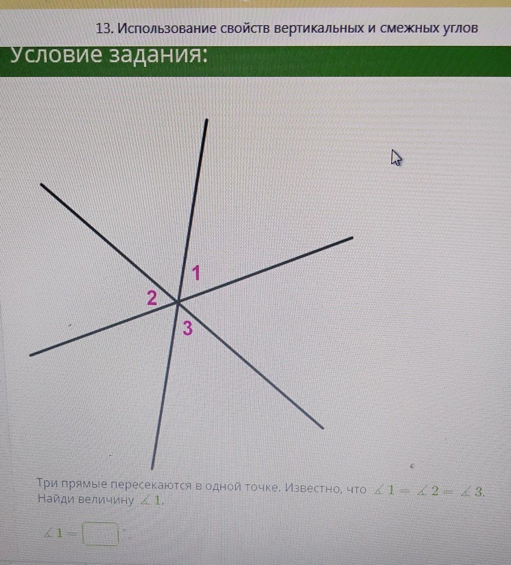 Три прямые пересекаются в одной точке. Известно, что угол 1 = углу 2 = углу3. найди величину 1.