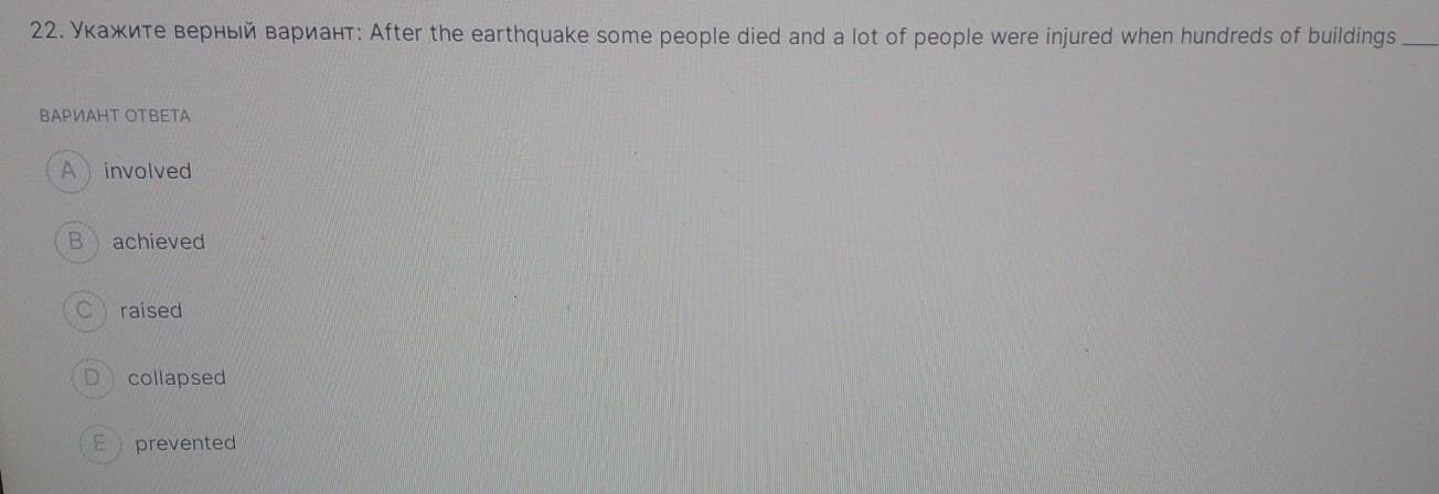 22. Укажите верный вариант: After the earthquake ѕоmе реорlе diеd аnd а lоt оf реорlе wеrе injured when hundreds of buildings ВАРИАНТ ОТВЕТА А involved B achieved raised D collapsed E prevented