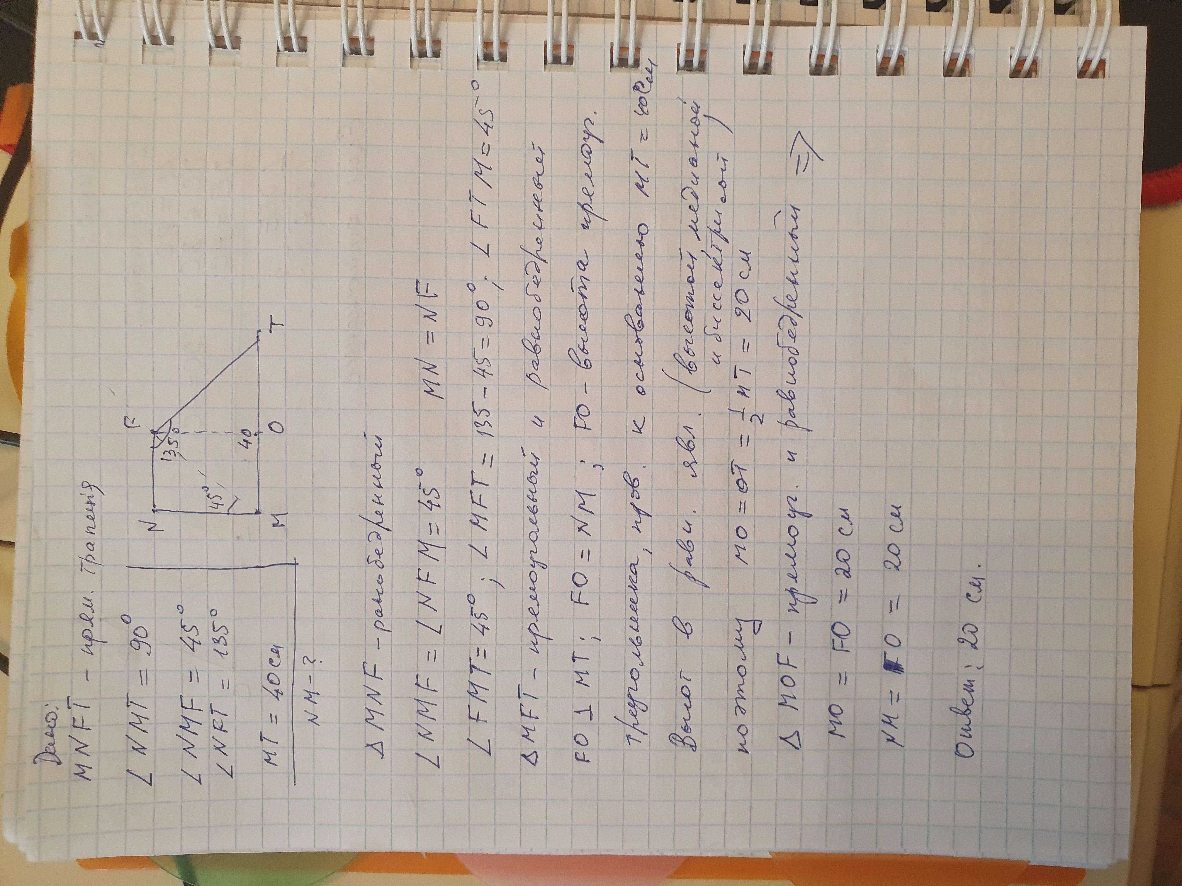У прямокутній трапеції MNFT ∠NMT - прямий, ∠NMF=45o, ∠NFT=135o, MT=40см. Тоді менша бічна сторона трапеції дорівнює