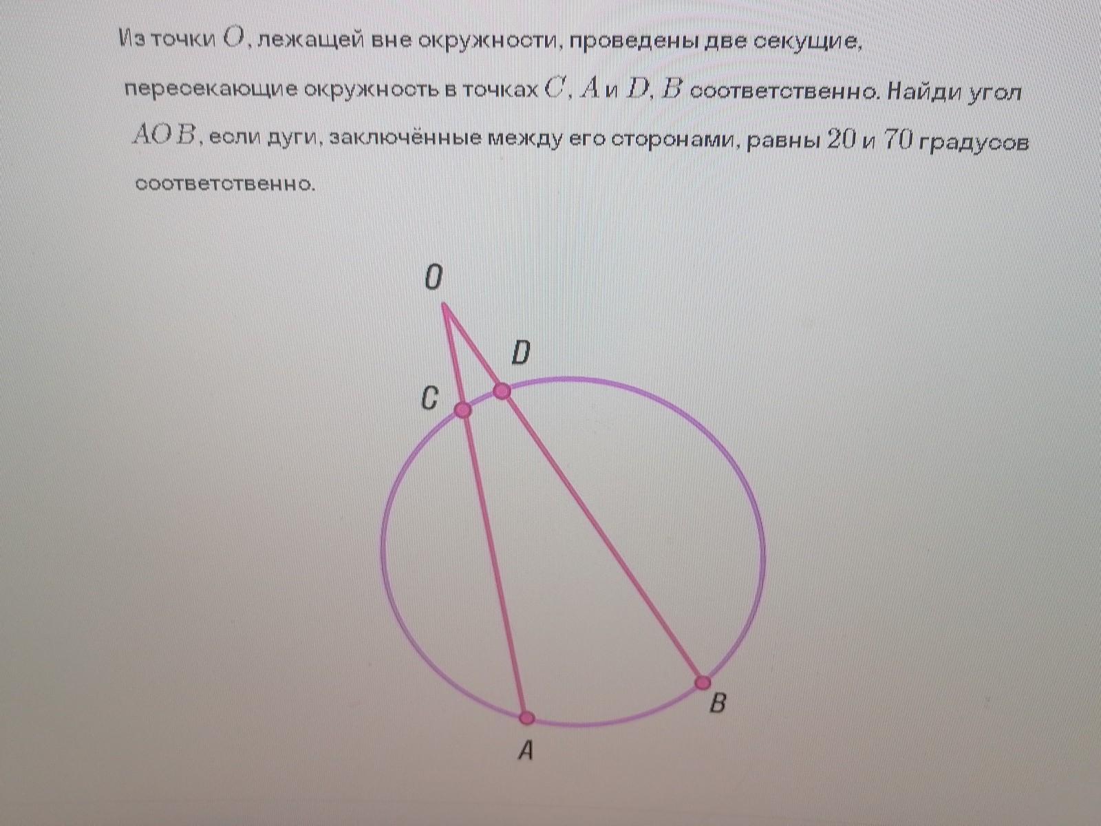 Из точки 0, лежащей вне окружности, проведены две секущие, пересекающие окружность в точках C, A и D, В соответственно. Найди угол AOB, если дуги, заключённые между его сторонами, равны 20 и 70 градусов соответственно